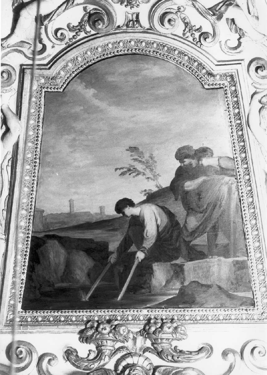 In primo piano una figura maschile sta immergendo due torce dalle rive rocciose dello specchio d'acqua: quella spenta si accende e quella accesa si spegne. Accanto, altre due figure osservano la scena mentre lo sfondo si apre in un paesaggio con una città in lontananza