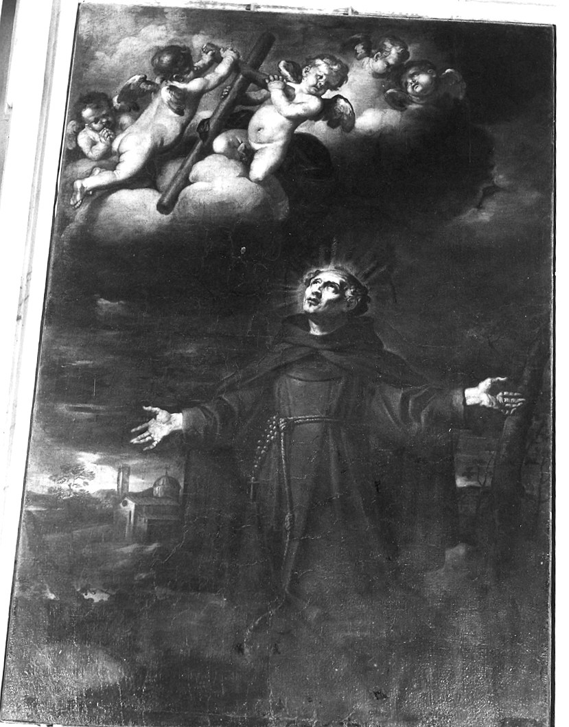 Personaggi: San Pietro d'Alcantara. Attributi: (San Pietro d'Alcantara) saio francescano. Figure: angeli. Simboli della passione: croce. Paesaggi: vallata con edificio ecclesiastico. Fenomeni naturali: nubi. Fenomeni divini: luce