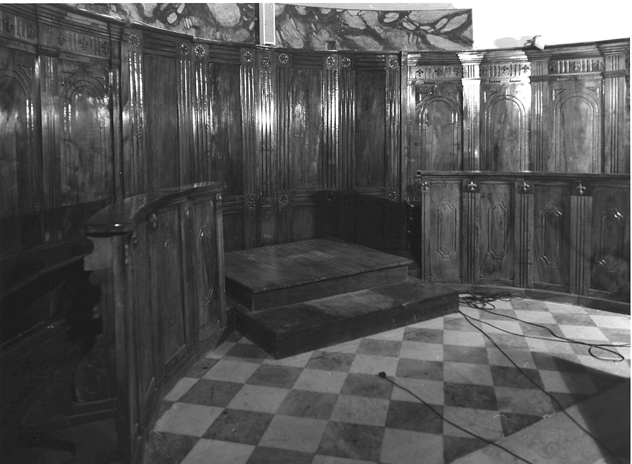 Il complesso semicircolare del coro è costituito da otto stalli, quattro per ogni lato con spalliera scandita da semipilastri scanalati con capitelli. Il dossale è liscio profilato da sottili incorniciature aggettanti compartito da specchiature rettangolari recanti motivi geometrici. Una cornice lineare dentellata corre lungo il bordo superiore, al di sopra del fregio con baccelli alternati a gigli. il piano della seduta a panca poggia su mensole sagomate