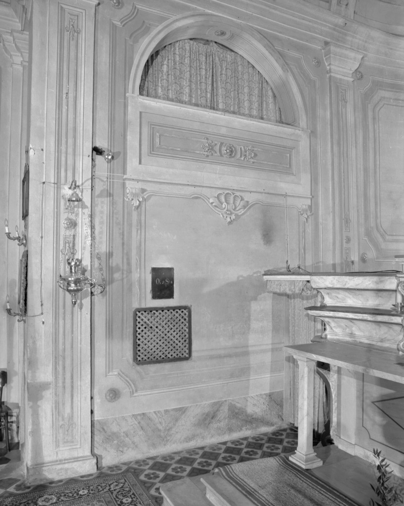 Le pareti del presbiterio sono decorate a specchiature con cornici mistilinee, lesene e pilastri decorati con rosette, motivi vegetali e conchiglie