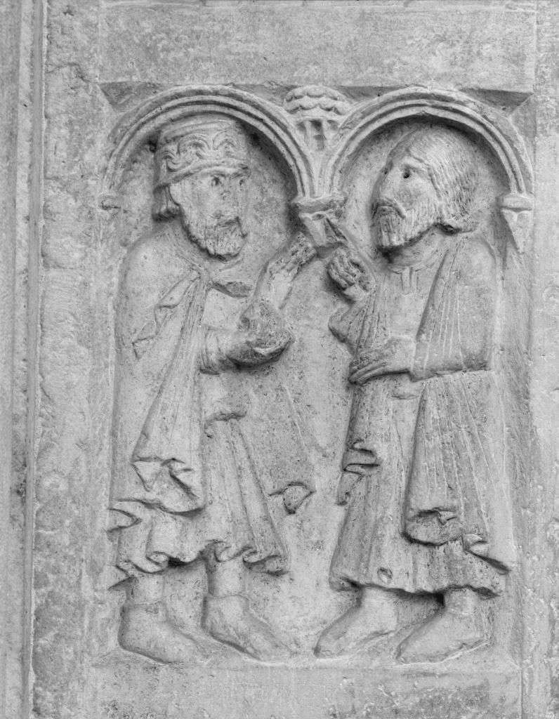 Astolfo e Anselmo sono rappresentati di profilo, in primo piano, in una architettura ad archi
