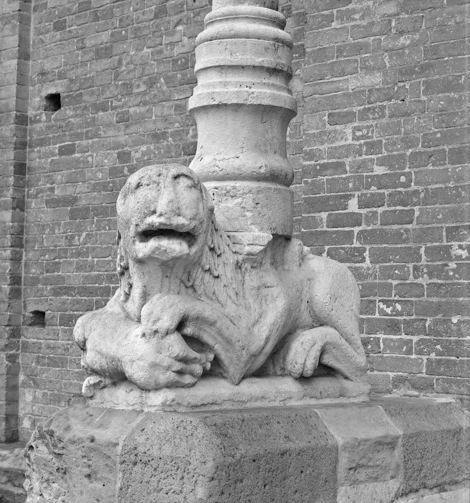 Il leone stiloforo accasciato a fauci spalancate, posto su un alto basamento, regge la colonna di sostegno del protiro