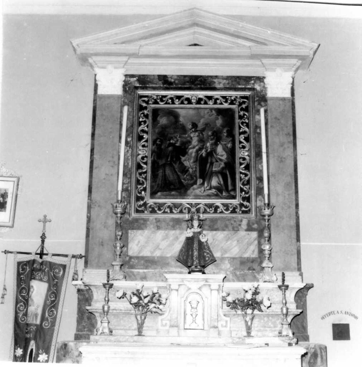 Struttura architettonica in scagliola con paraste lisce, a finto marmo giallo e capitelli corinzi bianchi su cui poggia la trabeazione agettante dal profilo triangolare. I fondi delle specchiature sono in verde brecciato e bruno
