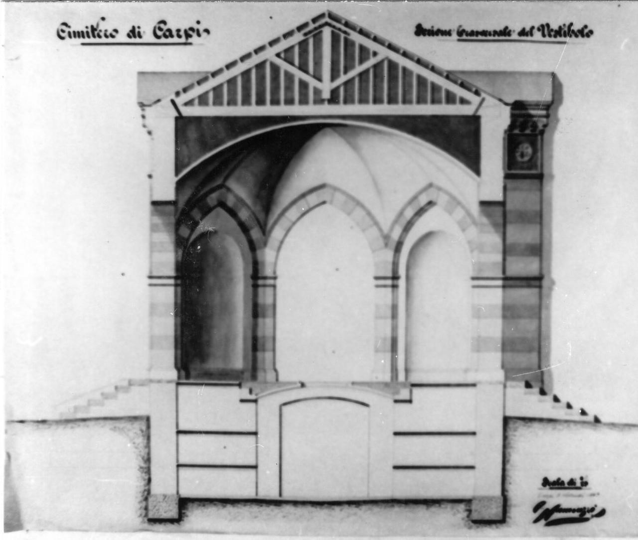 Disegno a penna su carta, acquerellato. Raffigura la sezione del vestibolo del Cimitero urbano di Carpi nei suoi valori architettonici e decorativi
