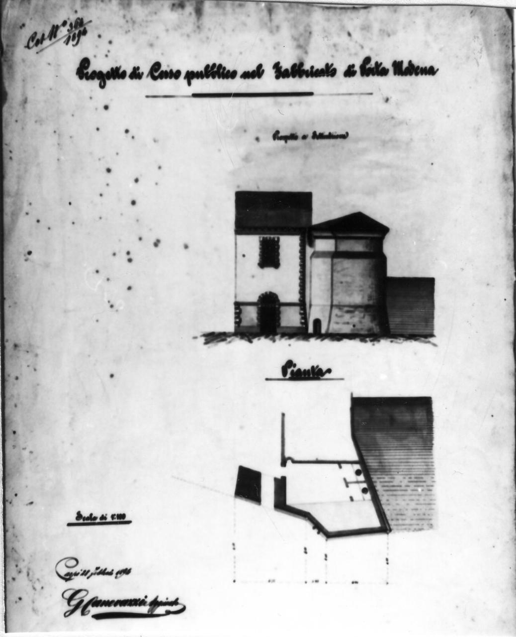Raffigura il progetto di una latrina pubblica presso la porta di Modena come pianta e prospetto di parte della porta con torrione