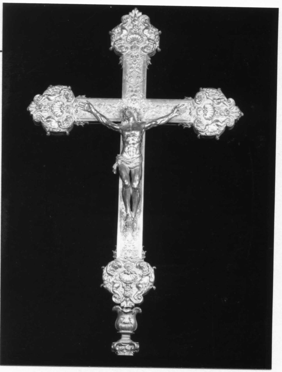 Croce ricca di elementi vegetali e a conchiglia sbalzati e cesellati sulla base di argento. Al centro Cristo crocifisso