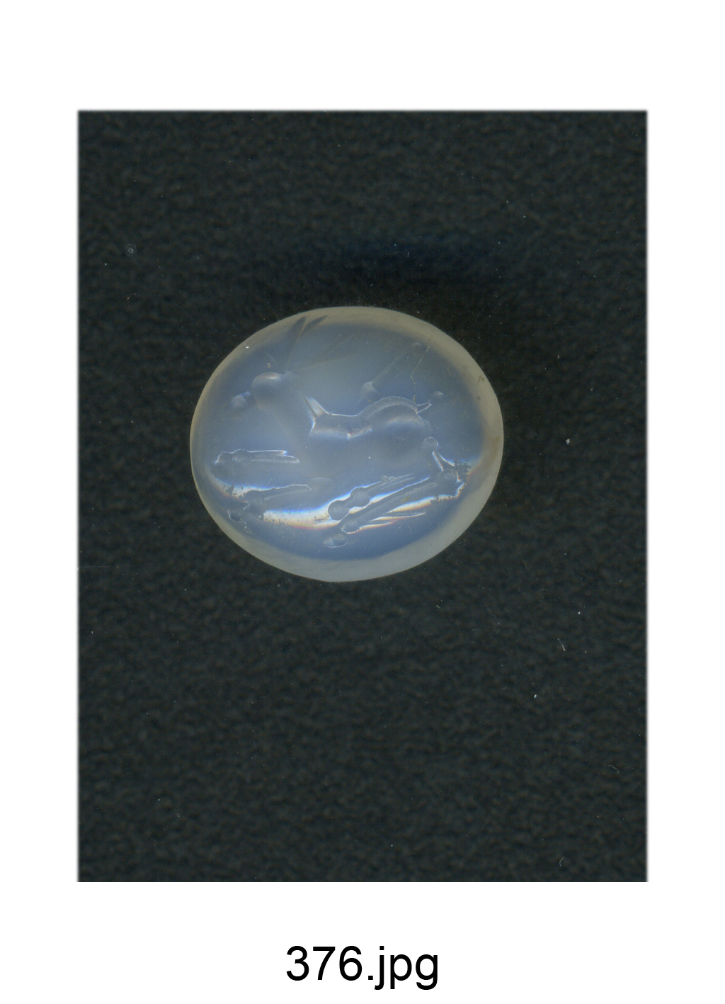 Calcedonio grigio-azzurro traslucido. Forma ellittica; Zwierlein-Diehl 13. Cervo (?) accucciato verso s. Sullo sfondo, un oggetto di forma lineare non meglio identificabile