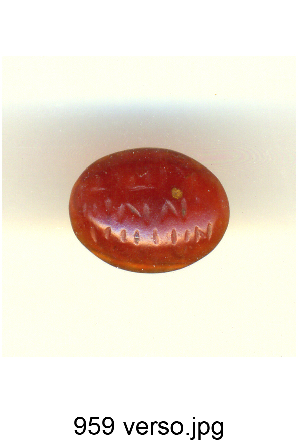 Corniola rossa. Forma ellittica; Zwierlein-Diehl 1.1. Leone gradiente a s. con oggetto non chiaramente identificabile in bocca; sopra, nel campo, un fascio di fulmini, stella sulla testa. Linea di base. Sul retro iscrizione "magica"