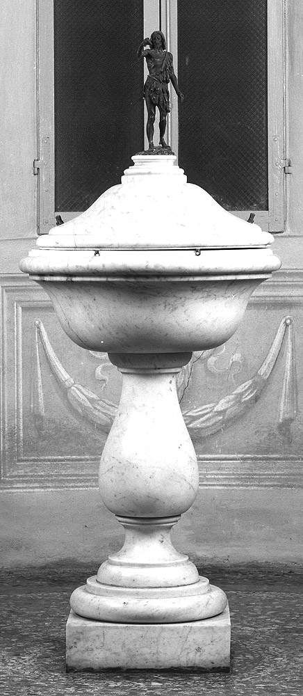 Base, fusto, vasca e coperchio sono in marmo, mentre il Battista posto in cima è in bronzo