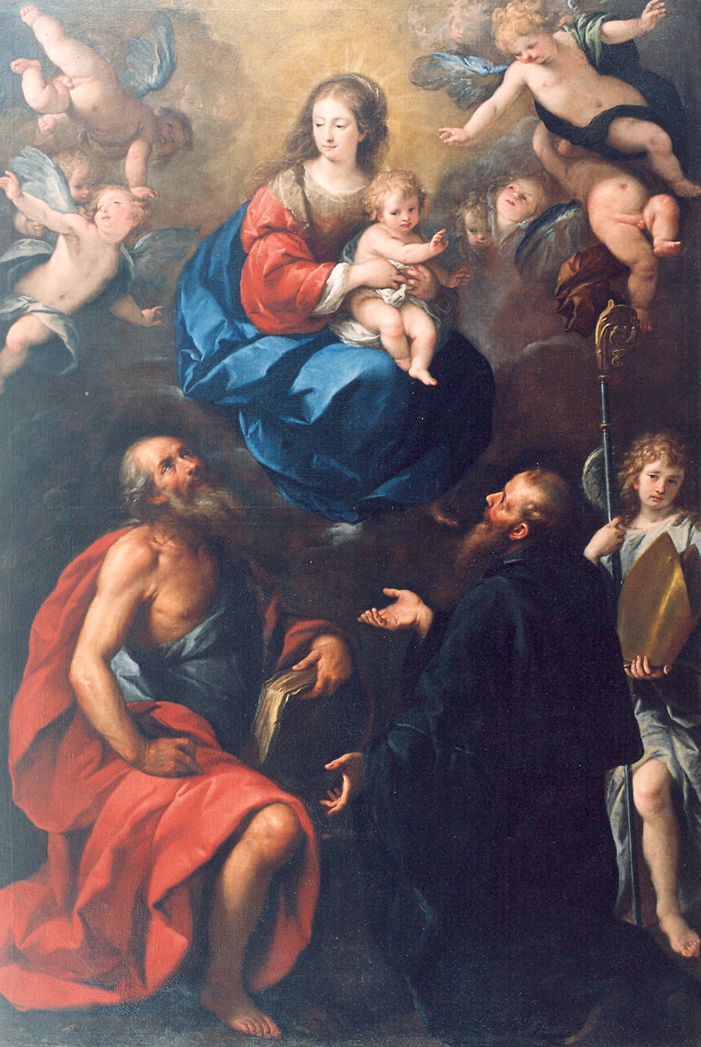- NOTIZIE STORICO CRITICHE Il primo autore che fa cenno a questa tela è lo Scarabelli (1841) che descrive la chiesa affermando che "a mano sinistra è una Madonna coi SS. Girolamo e Benedetto di Giuseppe Nuvolari". Una attribuzione questa ripresa in seguito anche dagli altri autori che si sono occupati della chiesa e del complesso cimiteriale. Più dettagliato è invece l'intervento del Nasalli, che nel 1977 osservava come la tela stesse "prima del 1810 nella chiesa delle monache di S. Girolamo" da dove venne trasferita, a causa della soppressione francese delle corporazioni religiose, dapprima nel vescovado e quindi nella chiesa del cimitero. D'altra parte l'iconografia generale del dipinto sembrerebbe convalidare questa provenienza. L'attribuzione di questo dipinto al Nuvolone contribuisce a chiarire ancora di più l'attività del pittore, a lungo collaboratore del fratello Carlo Francesco, nell'area lombarda e piacentina, giacchè come ha notato di recente anche la Ward Neilson "la sua pittura (è) caratterizzata dall'innesto delle riforme della scuola emiliana e genovese su quella lombarda". Modi questi che sembrano esplicitarsi anche nella realizzazione di questa tela dove si trovano innestate quelle qualità di "pacata colloquialità uniti a un fare compositivo più pausato" già messe in luce dal Bora (p. 94)