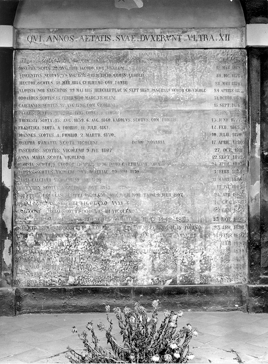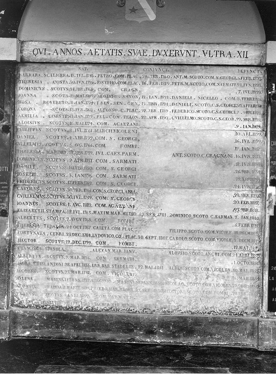 - NOTIZIE STORICO CRITICHE E' interessante notare come questo complesso di tre lapidi sia stato notato dallo Scarabelli (1841) che affermò riguardo la tomba Douglas Scotti: "esempio che dovrebbesi imitar dal Comune per tenere memoria durevole de' più illustri cittadini ( . . . ) oercchè le pareti di quelle tre appelle sono coperte da cima a fondo di gran lastre di marmo bianco, suvvi incisi e dorati i nomi de' morti della famiglia". E' qui indicativo come sia stato identificato nella semplicità di queste lastre il massimo della funzione di "memoria" storica dell'asse familiare. La lastra sepolcrale assolve quindi, in questo caso, una funzione del tutto analoga a quella dell'albero genealogico familiare
