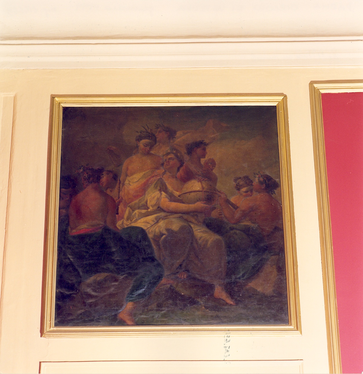 - NOTIZIE STORICO CRITICHE Questa sala presenta una boiserie sostanzialmente intatta in cui sono state inserite in epoca successiva quattro soprapporte con raffigurazioni mitologiche che tuttavia non appartengono ad una stessa serie ma a due distinte. Questa tela e quella raffigurante le "Arti rendono omaggio a Venezia" (cfr. scheda successiva), provenienti da un altro ambiente delle residenze ducali, sono state assegnate da Godi (1981) al pittore di formazione veneta Giustino Menescardi, al servizio della corte borbonica tra il 1752 e il 1770 ca. e di cui recentemente è stato ampliato il catalogo delle opere con ulteriori riconoscimenti e attribuzioni