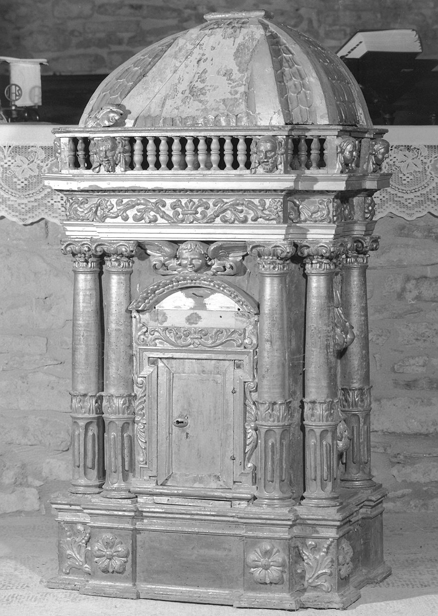 Tabernacolo in legno intagliato dorato e argentato, con struttura a tempietto caratterizzata da un alto basamento modanato con rosoncini a rilievo alternati a foglie d'acanto; prospetto a sei colonne corinzie con capitello composito e fusto liscio fino a un terzo della base, rudentato nella zona inferiore; trabeazione con fregio a motivi fitomorfi profilata da cornici medanate a più risalti e sormontata da una balaustra con mascheroni; cupola con vele delimitate da rilevati costoloni e coperta a pelte