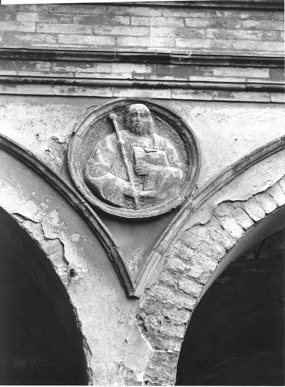 - NOTIZIE STORICO CRITICHE I tondi, collocati tra gli archi a pieno centro del chiostrino d'ingresso, hanno palesemente sofferto dell'esposizione agli agenti atmosferici. Non è più possibile leggere l'iscrizione con il nome dell'apostolo che in origine era incisa nella parte superiore di ciascun clipeo. Tale lettura è invece ancora possibile per i cinque tondi con altri mezzibusti di apostoli pressochè identici per materia, misure e stile, provenienti da un'antica proprietà olivetana a Verano di Podenzano e ora presso i Musei Civici di Palazzo Farnese; Arisi (1979) per primo ne segnalò l'esistenza e li mise in relazione con quelli ancora in loco presso la cosidetta casa dell'abate commendatario. In seguito Pronti (1988, pp. 170-171) propose per il ciclo una datazione agli anni 1460-1480. Più convincente Adorni (1997, p. 635; 1998, p. 88) ha riferito ad Alessio Tramello il progetto del chiostrino d'ingresso, riconducendolo a una data prossima al 1506; ne consegue che l'intero apparato decorativo, coevo all'architettura, sia parimenti da datare al primo decennio del Cinquecento