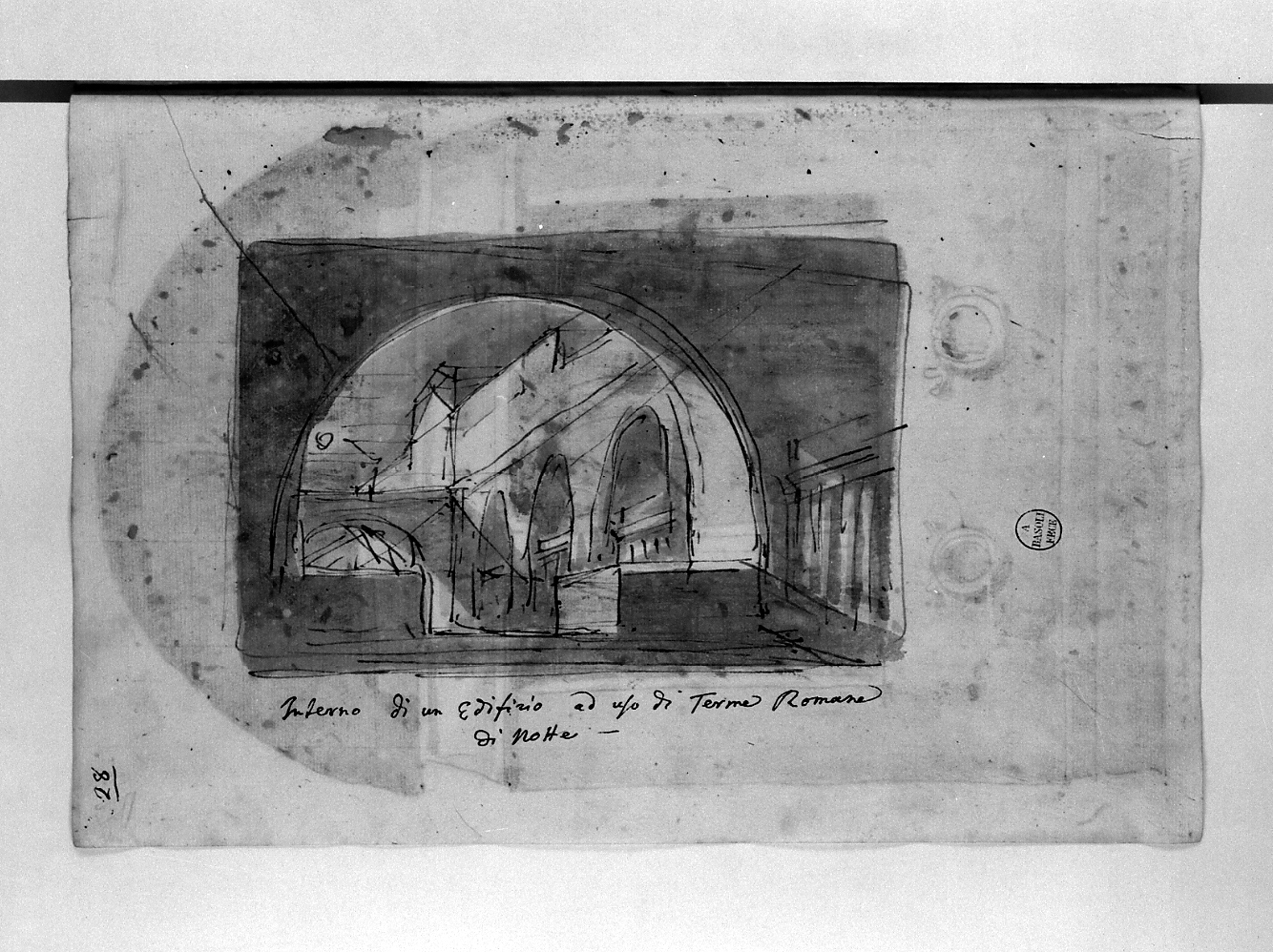 - ISCRIZIONI sotto disegno, lungo margine sinistro della pagina - INTERNO DI UN EDIFICIO AD USO DI TERME ROMANE/ DI NOTTE - A. Basoli - corsivo - a penna -