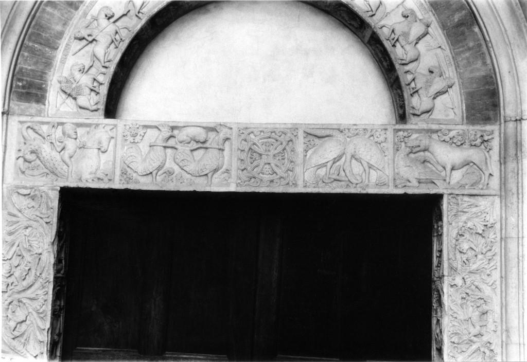 L'architrave presenta, entro riquadri una serie di animali e un motivo aniconico cruciforme. Partendo da sinistra vediamo: Nereide che cavalca un tritone, il funerale della volpe, una croce inscritta in un complesso sistema ad intreccio, due ibis