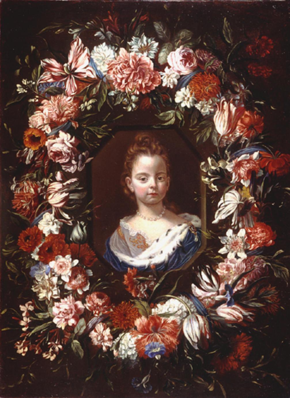 - NOTIZIE STORICO CRITICHE Il dipinto è comparso sul mercato antiquario londinese (Sotheby's, 23 aprile 1998, n. 189), insieme al suo pendant (scheda OA, n. catalogo generale 08/ 00374796), con l'attribuzione alla cerchia di Abraham Brueghel. Notificato dalla Soprintendenza per il Patrimonio Storico Artistico ed Etnoantropologico di Modena e Reggio Emilia come opera di collaborazione del pittore fiammingo con Carlo Maratta, è stato riconosciuto a Johannes Hermans, detto Monsù Aurora, da A. Galli, sulla base del confronto con una tela raffigurante "Fiori in un giardino con animali e busto di marmo" firmata dall'artista e datata 1653 (asta Finarte Roma, 21 novembre 1995, n. 161). Altro confronto istituito da Galli è quello con "Fiori diversi su sfondo di paesaggio, catino di tulipani e due porcellini d'India" nelle collezioni storiche medicee e pubblicato con il riferimento ad "anonimo fiammingo" alla mostra " La natura morta a palazzo e in villa. Le collezioni dei Medici e dei Lorena (Firenze 1998, pp. 44-45, n.8). La proposta identificativa di Galli è stata accolta abbastanza favorevolmente da L. Peruzzi, la quale riconosce "nella flagrante policromia delle corolle" del dipinto fiorentino "caratteri molto simili a quelli del quadro Finarte", così da essere accostato anche alla ghirlanda entro la quale è incastonato il ritratto della fanciulla (cfr. L. Peruzzi, in Banca Popolare dell'Emilia Romagna, 2006, p. 166)