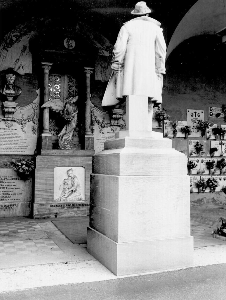 - NOTIZIE STORICO CRITICHE Questa scultura si pone come una sorta di delimitazione/chiusura della cappella della famiglia Serra-Bulloni (cfr.). La statua-ritratto realizzata dalla ditta di artigiani-scultori Leoni, molto attivi all'interno del cimitero di Parma, mostra un'anomala consapevolezza encomiastica. Il defunto non solo è ritratto secondo canoni fortemente realistici, indugiando nei particolari dell'abbigliamento e riuscendo persino a rendere le diverse "materie" modellate (si osservi il prezioso realismo del cappotto), ma la stessa posa vuole essere un'istantanea di vita, preferendo una sorta di vitalità interna che si manifesta anche nella scelta dell'atteggiamento scanzonato del defunto, con le mani in tasca e l'atteggiamento di fiduciosa attesa del futuro. Si tratta forse dell'unico caso, presente all'interno del cimitero di Parma, di realismo celebrativo, dove il ritratto di un comune committente viene trattato alla stessa stregua di una scultura pubblica, proprio come se questa statua potesse essere utilizzata per decorare una via o una piazza. La struttura architettonica si deve all'architetto Ettore Leoni che all'interno del cimitero di Parma realizzò numerose cappelle sepolcrali: cappelle Romanici, Cappella Bormioli, Cappella Leoni, Cappella Chiari, Cappella Tanzi