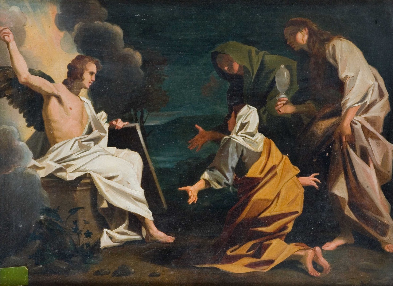 Personaggi: Maria Maddalena; Maria Salomè; Maria di Cleofa. Figure: angelo. Costruzioni: sepolcro. Oggetti: vasetto degli unguenti. Vegetali: albero; fogliami. Fenomeni naturali: oscurità. Fenomeni divini: nubi; alone luminoso