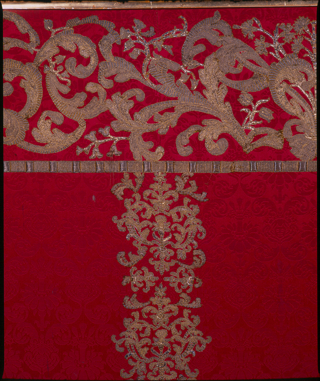 Ordito e trama di seta rossa eseguono il fondo in raso da 5 catena e il disegno del damasco in raso da 5 trama. Disegno a ricamo. Motivi a riporto (supporto in raso di seta perla) in oro filato, oro in lamina e cordoncino d'oro filato, ricamati a punto steso e fermati da legature in taffetas a spina. Su tre lati del paliotto si sviluppa un elaborato intreccio di racemi a voluta fioriti di tulipani, giunchiglie e garofani, trattenuti a mazzo da calici di foglie. Il resto del paliotto è ripartito da quattro fregi verticali e paralleli composti da candelabre vegetali. I motivi descritti in oro si sviluppano su un disegno del fondo rosso a maglie ovali definite da foglie a voluta e cherubini incoronati. Le maglie includono i simboli della Passione (chiodi, corona di spine e colonna) nascenti da una corolla tondeggiante. Gallone a telaio in oro filato a motivi geometrici
