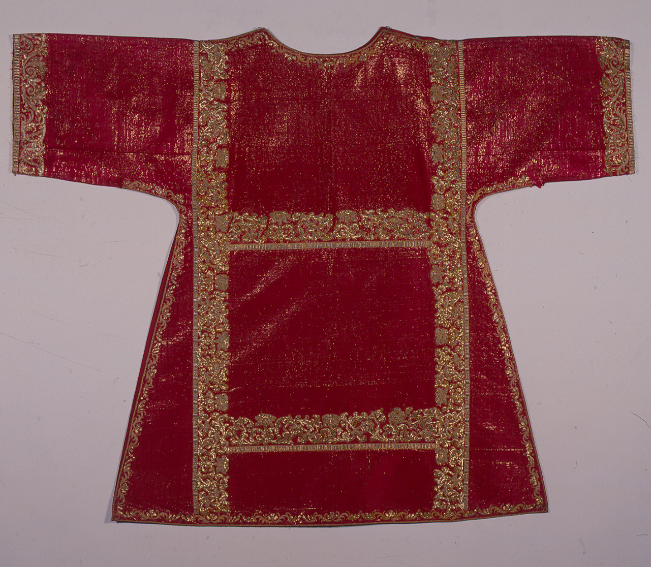 Parato composto da 2 pianete, 2 piviali, 2 tunicelle, 2 stole, 3 manipoli, 2 borse, 1 velo. Fondo in taffetas, ordito e trama di seta rossa, ricoperto da una trama lanciata in lamina d'oro, che, passata in tutti i colpi di fondo, è legata in taffetas da ¼ dei fili d'ordito. Disegno in oro filato, filato a treccia e lamina ricamati a punto steso e fermati da legature in taffetas. Nelle tonacelle ricami in lamina a rilievo (imbottitura fili lino). Accessori con integrazioni a ricamo in oro trafilato e paillettes dorate; croci di 1 stola e di 1 manipolo ricamate a rilievo (imbottitura cartone). Disegno definito da sequenza continua di coppie di racemi a voluta d'oro tangenti e speculari che si sviluppa lungo i bordi del parato e nei contorni degli stoloni. Nelle tonacelle decoro vegetale più articolato e con garofani; nel velo e in 1 borsa tralci di foglie ondulanti. Stole, manipoli e borse presentano croci raggiate aggiunte. Rifiniture a ricamo in oro che simulano galloni a cannettature (pianete e piviali) e a motivi geometrici (tonacelle); galloni in oro filato a telaio (piviale) e a fuselli (cappuccio piviale), in oro filato, riccio e lamina a fuselli (1 stola, 2 manipoli). Fodere in taffetas di diverso tipo