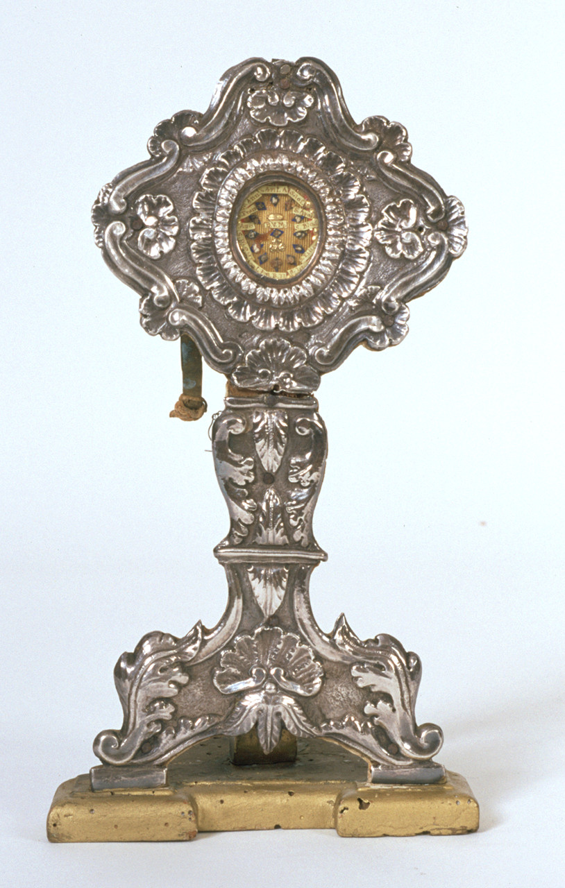 Reliquiario a ostensorio in lamina d'argento sbalzata su supporto ligneo
