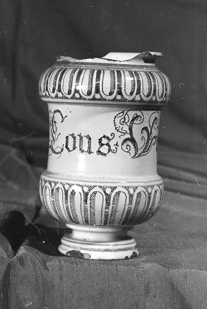 - NOTIZIE STORICO CRITICHE La scritta si riferisce alla Conserva di viole, dissetante e antinfiammatorio. Il vaso appartiene al gruppo numericamente più cospicuo del corredo ceramico della Spezieria, caratterizzato dal diffuso decoro barocco a doppia baccellatura, che in queste forme si afferma nella maiolica tra Sei e Settecento. Problematica l'individuazione dell'ambito di provenienza, presentando caratteri comuni al vasellame di farmacia di molte officine dell'Italia settentrionale