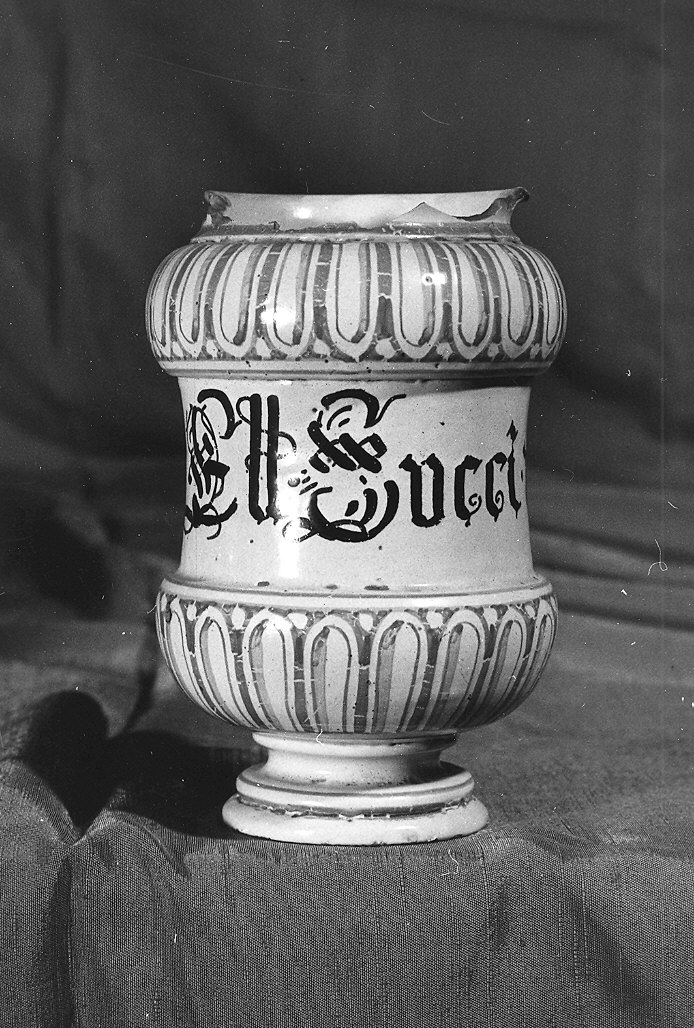 - NOTIZIE STORICO CRITICHE La scritta si riferisce all'Elettuario di succo di rose, purgativo. Il vaso appartiene al gruppo numericamente più cospicuo del corredo ceramico della Spezieria, caratterizzato dal diffuso decoro barocco a doppia baccellatura, che in queste forme si afferma nella maiolica tra Sei e Settecento. Problematica l'individuazione dell'ambito di provenienza, presentando caratteri comuni al vasellame di farmacia di molte officine dell'Italia settentrionale