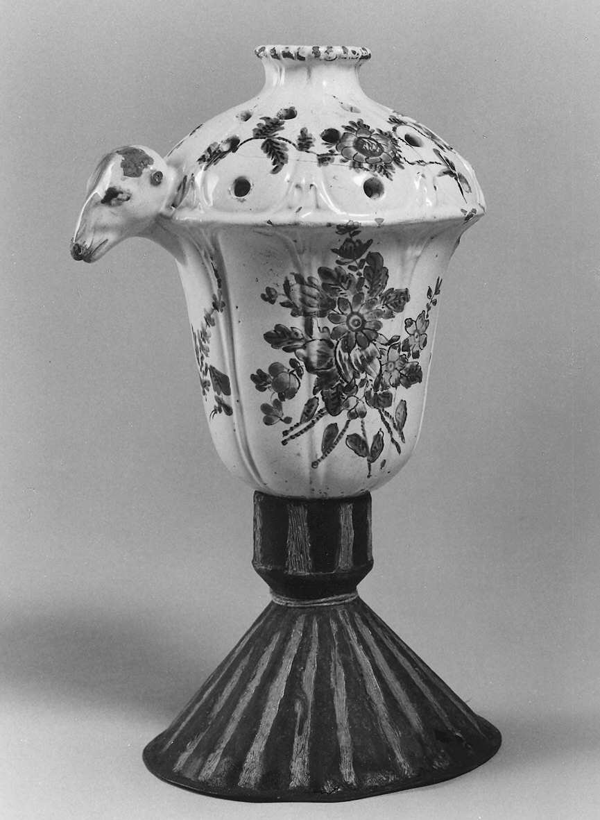 Escluso il piede che è in metallo, il vaso presenta corpo campaniforme con costolature verticali, che superiormente si sviluppa a cupola dotata di fori, originariamente forse portafiori, terminante con una piccola bocca ad orlo estroflesso; ai lati era dotato di due prese a testa di pecora. La decorazione si compone di due boquet di fiori sulle due facce e superiormente di rametti fioriti. Dipinto in arancio, blu, bruno, giallo e verde