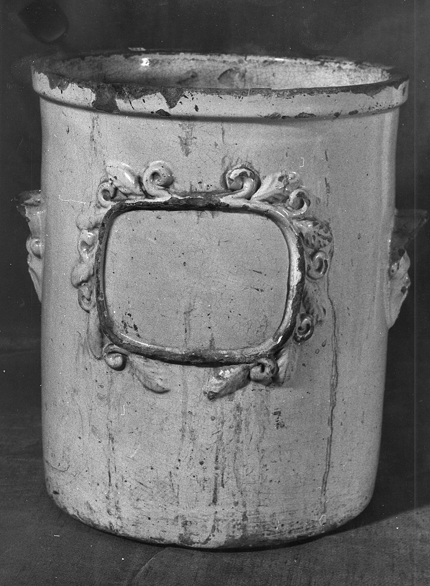 Vasone a corpo cilindrico con bocca modellata a fascetta. Sulle due facce si nota una cartella quadrangolare incorniciata, modellata a bassorilievo, e sui fianchi due prese plastiche a mascherone con capo a conchiglia. Privo di decorazione e con smaltatura applicata sia all'esterno sia all'interno