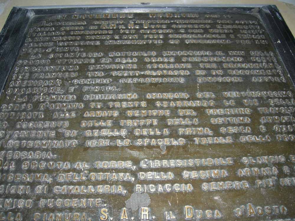 - ISCRIZIONI a tutto campo - IV NOVEMBRE MXMXVIII ORE 16/ LA GUERRA CONTRO L'AUSTRIA-UNGHERIA CHE SOTTO/ L'ALTA GUIDA DI S. M. IL RE DUCE SUPREMO L'ESERCITO/ ITALIANO INFERIORE PER NUMERO E PER MEZZI INIZIÒ/ IL XXIV MAGGIO MCMXV E CON FEDE INCROLLABILE E TENACE/ VALORE CONDUSSE ININTERROTTA ED ASPRISSIMA PER XLI/ MESI È VINTA./ LA GIGANTESCA BATTAGLIA INGAGGIATA IL XXIV DELLO/ SCORSO OTTOBRE ED ALLA QUALE PRENDEVANO PARTE/ CINQUANTUNA DIVISIONI ITALIANE TRE BRITANICHE/ DUE FRANCESI UNA CZECO-SLOVACCA ED UN REGGIMENTO/ AMERICANO CONTRO SETTANTATRE DIVISIONI AUSTRO/ UNGARICHE, È FINITA./ LA FULMINEA ARDITISSIMA AVANZATA DEL VENTINOVESIMO/ CORPO D'ARMATA SU TRENTO SBARRANDO LE VIE DELLA/ RITIRATA DELLE ARMATE NEMICHE DEL TRENTINO TRAVOLTE/ AD OCCIDENTE DELLE TRUPPE DELLA SETTIMA ARMATA E/ AD ORIENTE DA QUELLE DELLA PRIMA, SESTA E QUARTA/ HA DETERMINATO IERI LO SFACELO TOTALE DELLA FRONTE/ AVVERSARIA./ DAL BRENTA AL TORRE L'IRRESISTIBILE SLANCIO DELLA/ DODICESIMA, DELL'OTTAVA, DELLA DECIMA ARMATA E DELLE/ DIVISIONI DI CAVALLERIA RICACCIA SEMPRE PIÙ INDIETRO/ IL NEMICO FUGGENTE./ NELLA PIANURA. S. A. R. IL DUCA D'AOSTA AVANZA/ RAPIDAMENTE ALLA TESTA DELLA SUA INVITTA TERZA/ ARMATA ANELANTE DI RITORNARE SULLE POSIZIONI DA ESSA GIÀ/ VITTORIOSAMENTE CONQUISTATE CHE MAI AVEVA PERDUTE./ L'ESERCITO AUSTRO-UNGARICO È ANNIENTATO: ESSO HA/ SUBITO PERDITE GRAVISSIME NELL'ACCANITA RESISTENZA/ DEI PRIMI GIORNI E NELL'INSEGUIMENTO HA PERDUTO QUANTITÀ/ INGENTISSIME DI MATERIALE DI OGNI SORTA E PRESSOCHÉ PER/ INTERO I SUOI MAGAZZINI E I DEPOSITI: HA LASCIATO FINORA/ NELLE NOSTRE MANI CIRCA TRECENTOMILA PRIGIONIERI CON/ INTERI STATI MAGGIORI E NON MENO DI CINQUEMILA CANNONI./ I RESTI DI QUELLO CHE FU UNO DEI PIÙ POTENTI ESERCITI/ DEL MONDO RISALGONO IN DISORDINE E SENZA SPERANZA/ LE VALLI CHE AVEVANO DISCESO CON ORGOGLIOSA SICUREZZA/ COMANDO SUPREMO/ GENERALE DIAZ - lettere capitali - a rilievo -