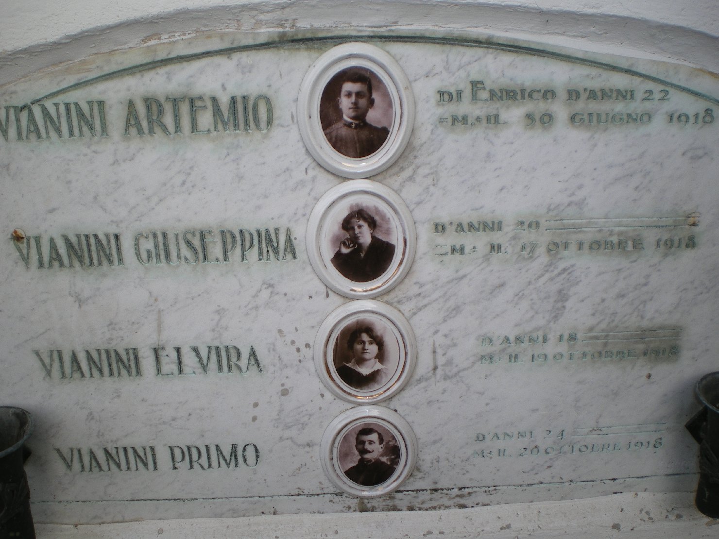 - ISCRIZIONI a tutto campo, a sinistra e a destra delle 4 fotoceramiche - VIANINI ARTEMIO DI ENRICO D'ANNI 22/ M. IL 30 GIUGNO 1918/ VIANINI GIUSEPPINA D'ANNI 40/ M. IL 17 OTTOBRE 1918/ VIANINI ELVIRA D'ANNI 18/ M. IL 19 OTTOBRE 1918/ VIANINI PRIMO D'ANNI 24/ MORTO IL 20 OTTOBRE 1918 - lettere capitali/ numeri arabi - a solchi -