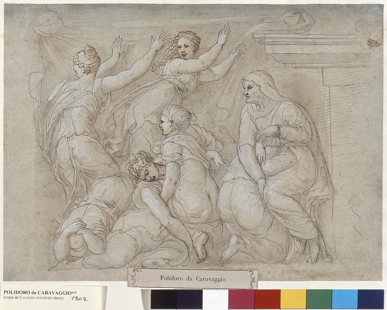 - NOTIZIE STORICO CRITICHE Anticamente classificato come Polidoro da Caravaggio, e come tale considerato anche da Castellani Tarabini (n. 211), è più correttamente da considerarsi copia, forse della metà del Cinquecento, di un segmento a destra della scena "Diana saetta le figlie di Niobe" tratta dal fregio di Niobe del Palazzo Milesi "alla maschera d'oro" di Roma, opera dipinta tra le ultime da Polidoro da Caravaggio. Il disegno non è di altissima qualità, e può essere classificato, in maniera indicativa, nell'ambito romano cinquecentesco
