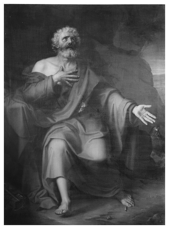 San Pietro, identificabile per la chiave raffigurata in basso sinistra appoggiata su una pietra scura e per il gallo sulla destra, è raffigurato in un paesaggio roccioso nell'atto di portarsi la mano destra la petto e con lo sguardo supllicante rivolto al cielo