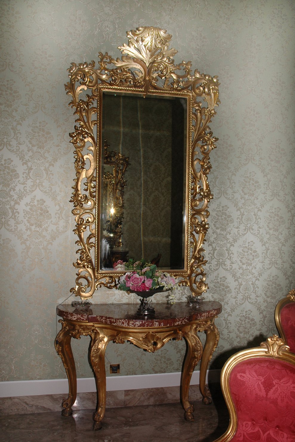 Specchiera di gusto settecentesco ornata da volute vegetali, da racemi fogliati e fiorati, rocaille e riccioli