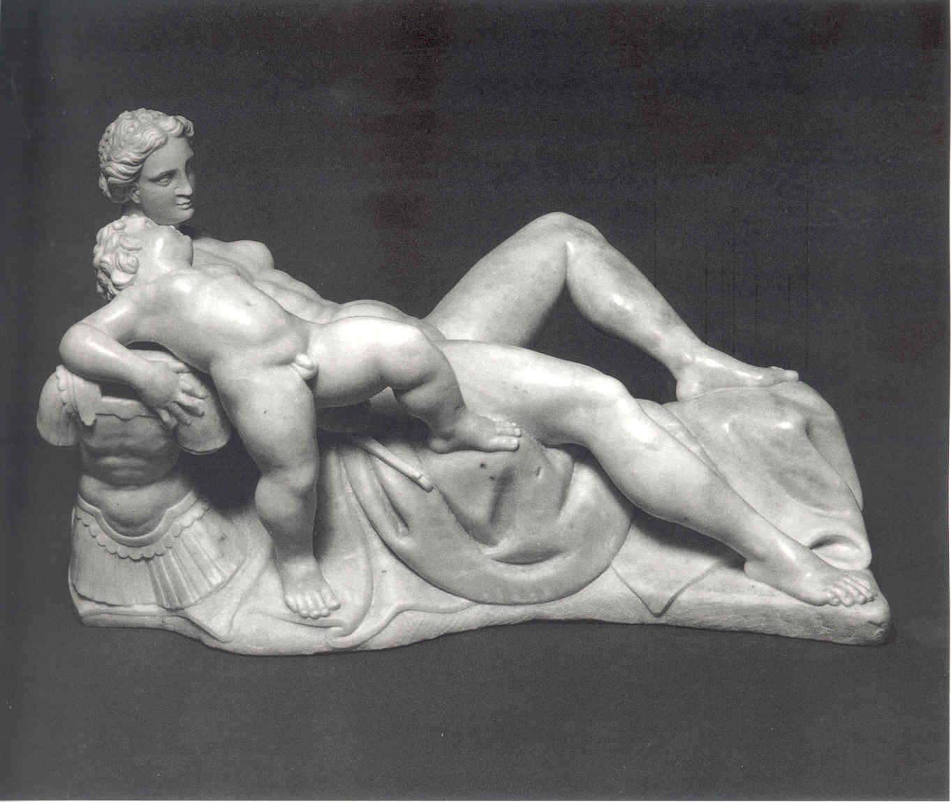 Scultura; Venere nuda sdraiata su di un letto rivestito da un drappo; Cupido sdraiato di fianco con braccio d. su armatura classica