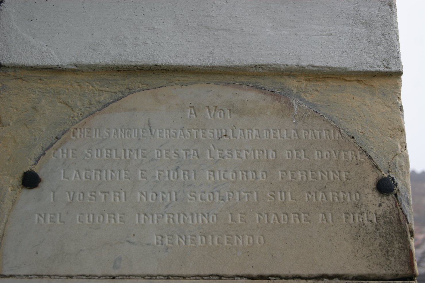 - ISCRIZIONI lapide sommitale - A VOI/ CHE IL SANGUE VERSASTE SULL'ARA DELLA PATRIA/ CHE SUBLIME DESTA L'ESEMPIO DEL DOVERE/ LAGRIME E FIORI RICORDO PERENNE/ I VOSTRI NOMI SCOLPITI SUL MARMO/ NEL CUORE IMPRIMINO LE MADRE AI FIGLI/ BENEDICENDO - capitale - a incisione -