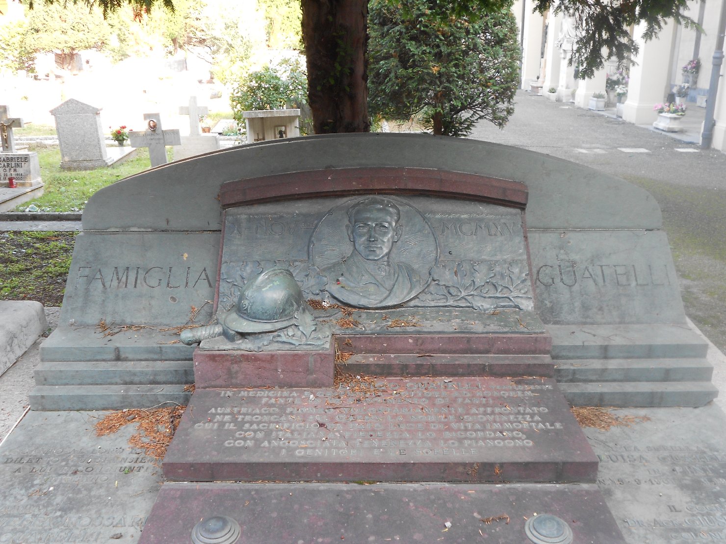Monumento composto da una lastra rettangolare in marmo verde, sulla quale poggia una lapide più piccola in marmo rosso, a sua volta rettangolare, fissata agli angoli da quattro borchie in bronzo. Nella parte superiore è posata un’altra lastra più piccola, in marmo rosso, sulla quale sono applicate lettere in bronzo che compongono la dedica al caduto della Grande Guerra. La targa regge un elemento verticale, leggermente centinato, dove è stata applicata una placca in bronzo con un medaglione che ritrae il volto del soldato, accompagnato da simboli militari (elmetto, spada, foglie di quercia). La decorazione è appoggiata su un altro elemento centinato, più grande, in marmo verde. Sul marmo, ai lati dell’immagine centrale, è riportata la scritta: “FAMIGLIA GUATELLI”