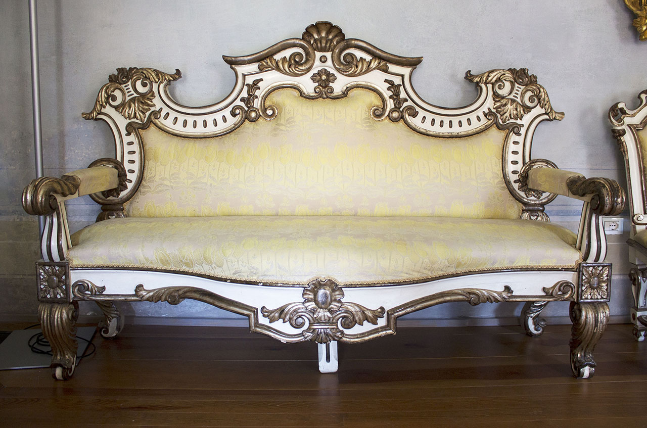 Coppia di divani in stile Luigi XIV in legno con laccatura color avorio su cui spiccano i fregi intagliati e dorati. Sedile, braccioli e schienale sono imbottiti e rivestiti da un tessuto operato a fiori (tulipani) color crema. Spalliera e traversa anteriore sono mosse in volute e i braccioli curvilinei. La spalliera ha una linea svasata con intagli a riccioli e motivi fogliacei sui lati raccordati da un elemento centrale a forma di conchiglia. Le gambe e i braccioli sono ricurvi ed ornati con motivi a foglia