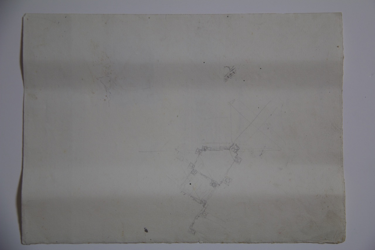Disegno a matita su carta da disegno. Resti della decorazione musiva del lato sinistro e del lato destro di un arco, intradosso della terza arcata sinistra del Battistero Neoniano di Ravenna. Sul verso schizzi di colonne addossate in piante