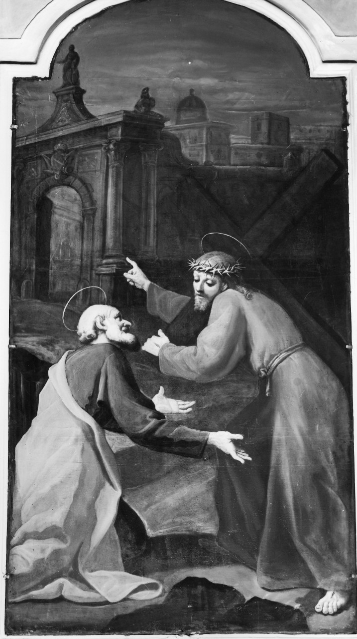 - NOTIZIE STORICO CRITICHE Grazie ad alcune memorie inedite manoscritte del 1777 tuttora conservate nell'archivio parrocchiale ad opera del Pievano Bernardino Lotti; sappiamo che la tela fu dipinta da un certo frate Felice della Sambuca, palermitano fratello laico dell'ordine dei Cappuccini. Citando di seguito dal manoscritto sopra indicato alle carte 5 e 6: "Restavi in ultimo da osservare li quattro quadri, situati nei quattro pilastri di questa chiesa, e sopra i confessionali nei quali, vi sono espressi diversi fatti dell'Apostolo San Pietro. Questi in quest'anno 1777 sono stati dipinti per commissione del Padre Luigi Sibaldi detto Luigi dal Borgo, segretario, e custode generale Cappuccino, commemorante in Roma quale lasciare una memoria di se a questa chiesa, ed a questa sua patria, ne ha fatto un generoso regalo, ed a bella posta ha fatto venire in Toscana, e nominatamente a questo Convento del Terricchio Fra Felice della Sambuca di Palermo Laico Cappuccino, Pittore, e religioso osservantissimo, ammirabile nel suo modo di dipingere, mentre nel corso di undici mesi, oltre aver fatto i quadri che vedonsi nella Chiesa, e Convento del Terricchio, ed altri per diversi Comuni di cappuccini di Toscana, che si fanno ascendere al numero di trenta, e più, in meno di due mesi ha ultimato li quattro sopra enunciati quadri, ed il quadro già descritto; situato nella Cappella del Santissimo Sacramento rappresentante San Francesco di Paola, ed altro quadro colla Santissima Vergine col Santissimo Bambino in braccio, con San Felice Cappuccino, ed il Beato Bernardo da Corleone, qual quadro servir deve per i Cappuccini di Pistoia, detti di sopra, avendo da se medesimo tirate tutte le tele, ed imprimite; cosa che sembrerà incredibile, ed un esagerazione, ma io stesso ed i Religiosi tutti di questo Monastero ne possiamo fare autentica fede, che in meno di due mesi esso ha ultimati detti sei quadri, non avendo mai lasciati gli atti della Comunità Religiosa, ogni mattina servita la maggior parte delle messe che sono state celebrate in essa, spese più ore nella sua quotidiana e particolari orazioni, e con tutto ciò, senza modelli, e privo d'ogn'altro mezzo di cui servir si sogliono anche i più eccellenti, e rinomati Professori di pittura, ha a mio giudizio eseguito in poche settimane, ciò che da chiunque altro fatto non sariasi nel corso di più anni; ne le dilui opere sono apprezzabili, vedendosi in esse un aggiustato disegno, un attitudine espressiva, ed un colorito naturale e vivace; e per dir tutto in una parola, è da credersi, che nel suo dipingere vi concorra uno speciale aiuto di Dio, e che coll'orazione operi più, che collo studio, e coll'applicazione." Vediamo qui nell'opera un pittore altrimenti ignoto ai repertori di storia dell'arte e dicitura composita. Nativo di Palermo, come sappiamo dalla relazione di Bernardino Lotti, sembra avere in qualche misura assunto i modelli della pittura meridionale barocco-naturalistica alla Mattia Preti. In realtà, come gli altri dipinti della serie, riflettono una singolare vena ironica ed arcaica, non priva di qualità pittoriche