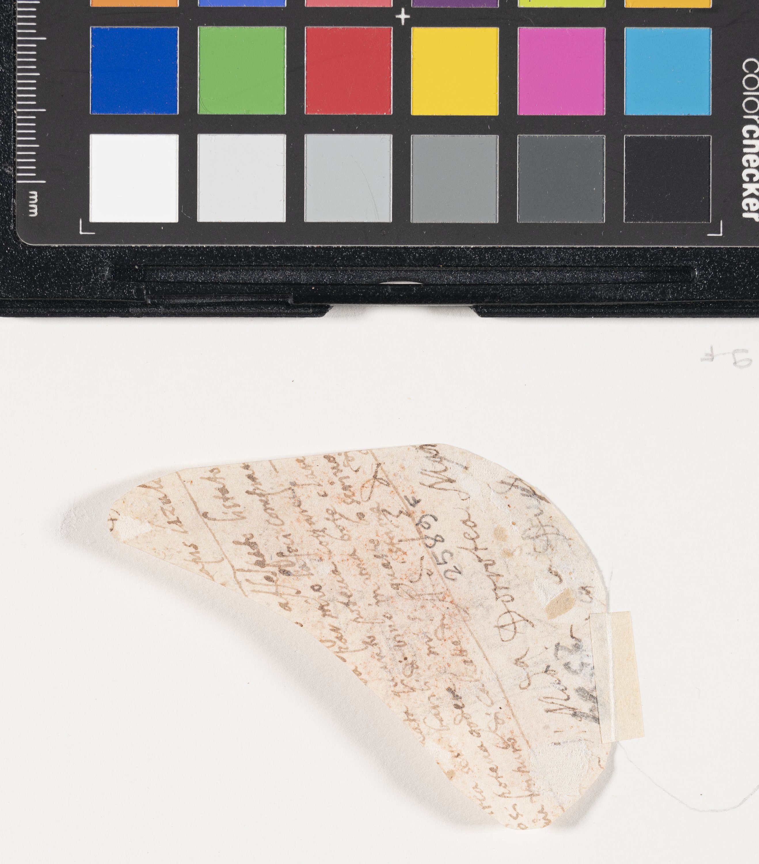 Un uomo seduto con il cappello piumato è seduto volto di profilo a sinistra in atto di scrivere. Sul verso è presente un frammento di una lettera