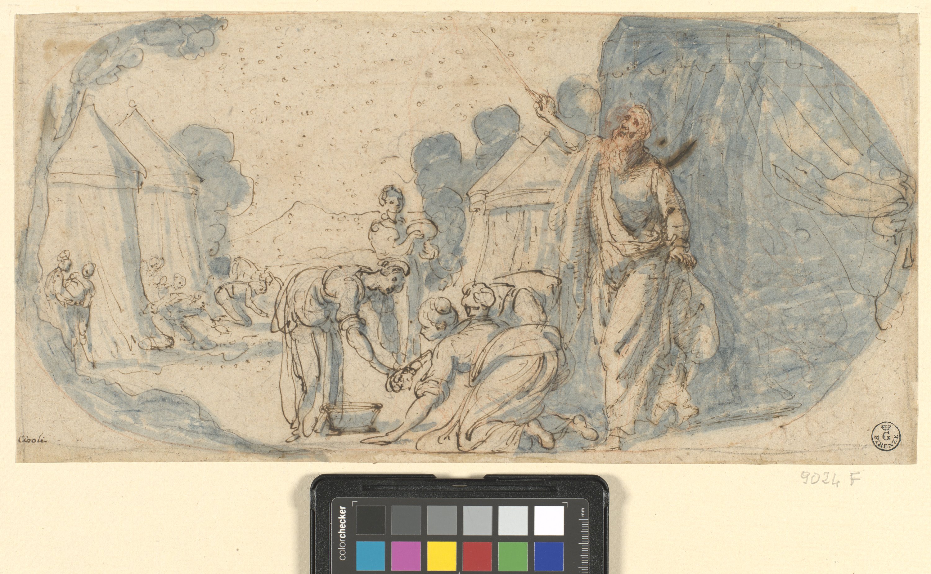 - NOTIZIE STORICO CRITICHE Nella scheda degli Uffizi il disegno è attribuito al Cigoli, ma a mio parere non è assolutamente di questo pittore, né della sua cerchia diretta, e pertanto lo assegno ad un artista anonimo degli inizi del Seicento. Alla luce di nuovi studi stilistici, il presente foglio, viene attribuito al Cigoli e si ritiene sia un'idea per l'affresco di Villa Muti a Grottaferrata; affresco realizzato poi nel 1630 ca. dal pittore Simone Lagi (1992, scheda OA 12/00236532)