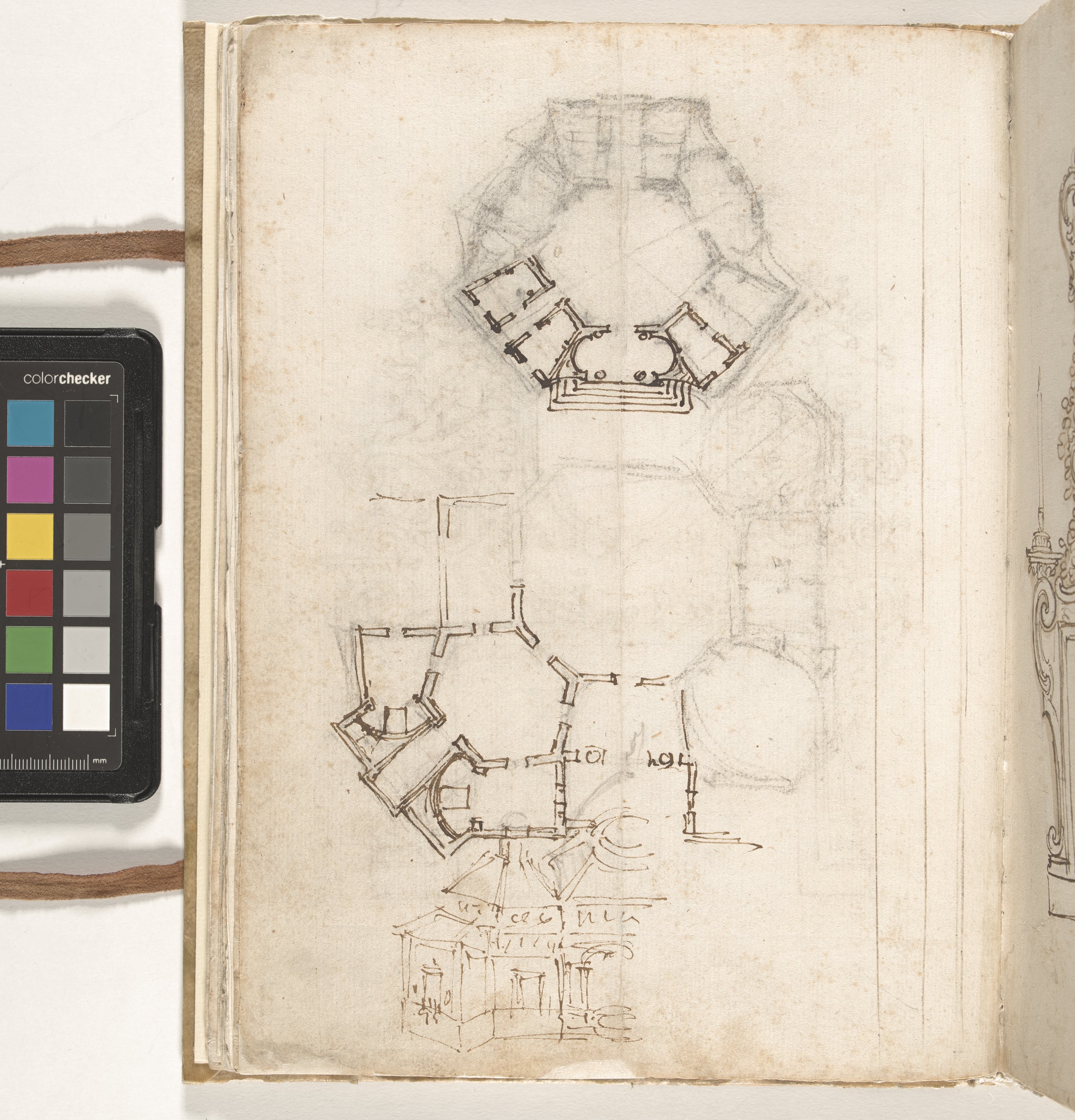 - NOTIZIE STORICO CRITICHE Sul recto studio di caminetto variante di quello del foglio 8027 A c. 27r (0900015700); nel verso pianta e alzato di villa come al foglio 8027 A c. 18v. (0900015695), a cui schede si rimanda per le notizie. Una pianta di villa presente sul verso è molto vicina a quella del foglio 27v, mentre un'altra ha il perimetro esterno quadrangolare ma con gli angoli smussati. Infine il prospetto delineato nella parte inferiore del foglio si riferisce a una villa con ali laterali sul tipo di quella del foglio 30v. Il foglio, per la posizione nel Giornale, è databile agli anni intorno al 1713