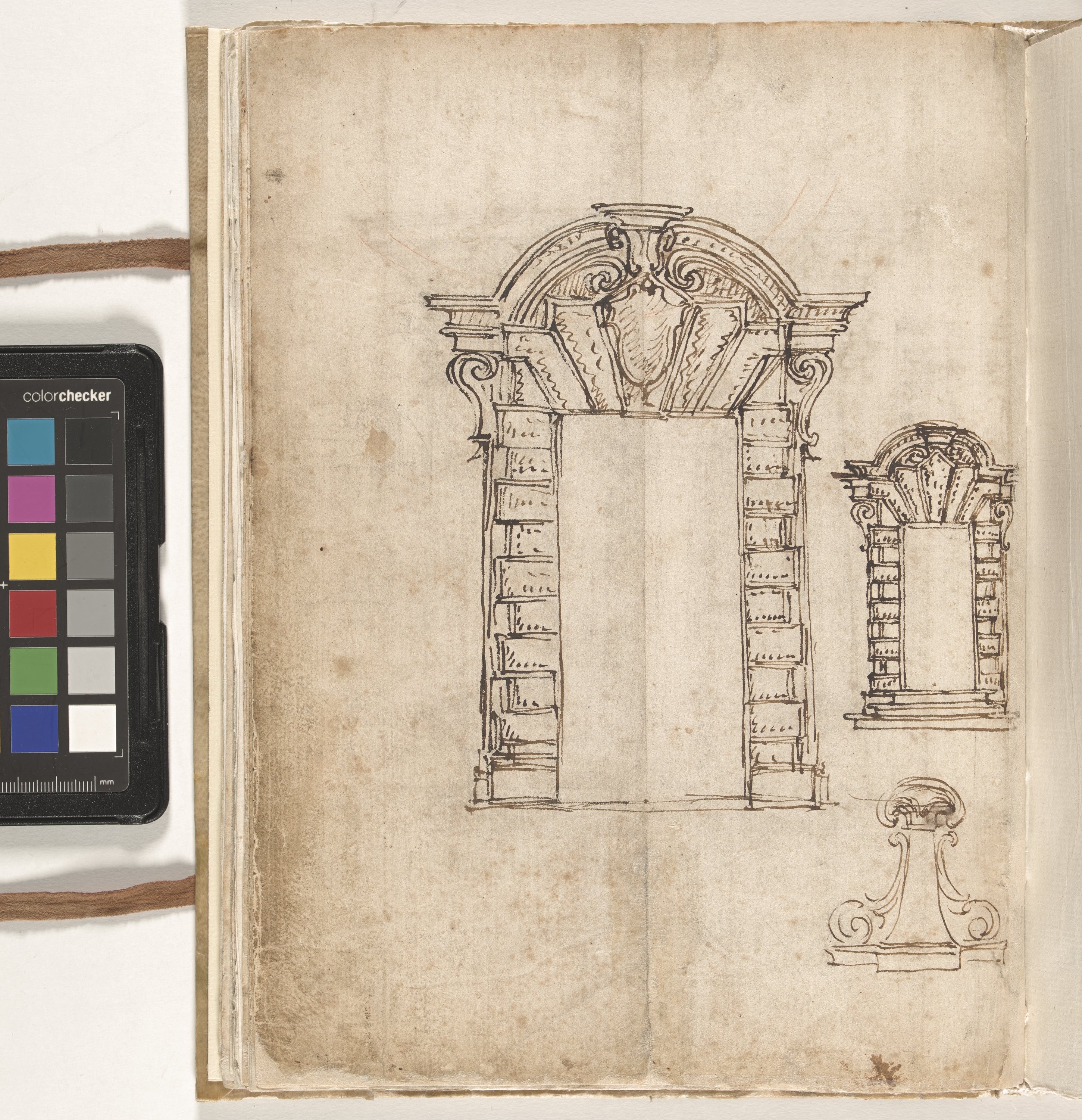 recto: Portale a bugnato rustico con supporto per balcone; a sinistra del foglio, studio di parasta con capitello. verso: Due portali a bugnato rustico di cui uno con stemma; a destra del foglio un elemento decorativo architettonico a punta