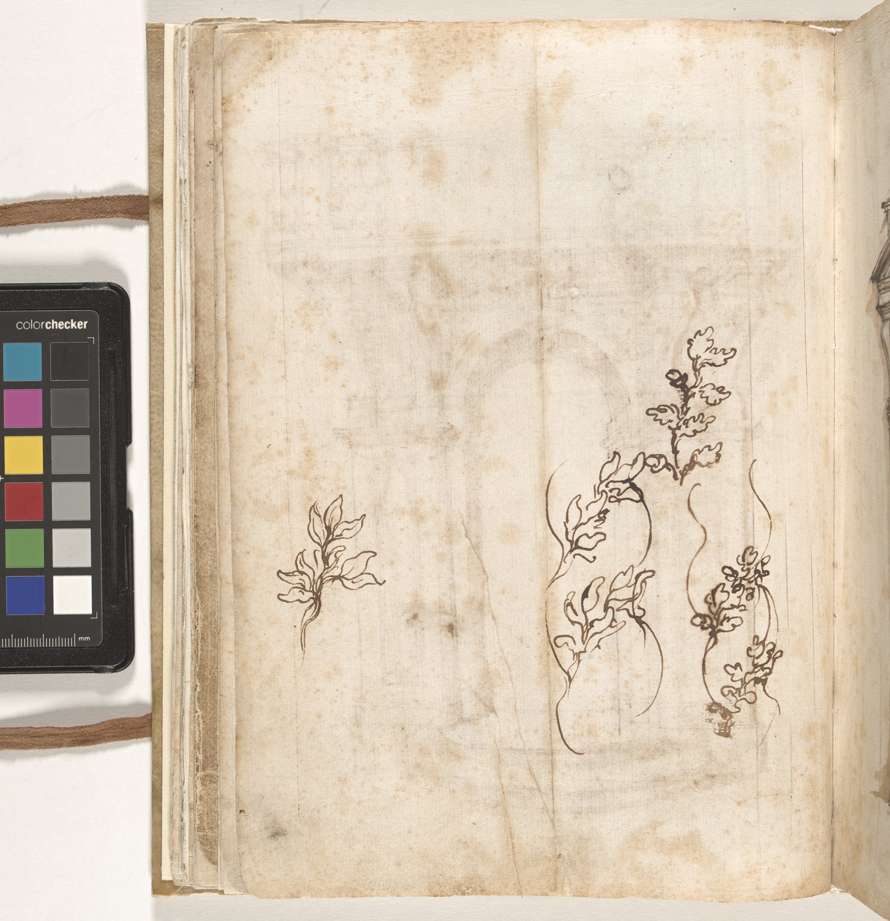 recto: Portale con specchiature laterali e mensola al centro. Altre mensole ai lati che sorreggono un balcone con parapetto formato da balaustri. verso: Accenni di colonne tortili con motivi decorativi a fogliame