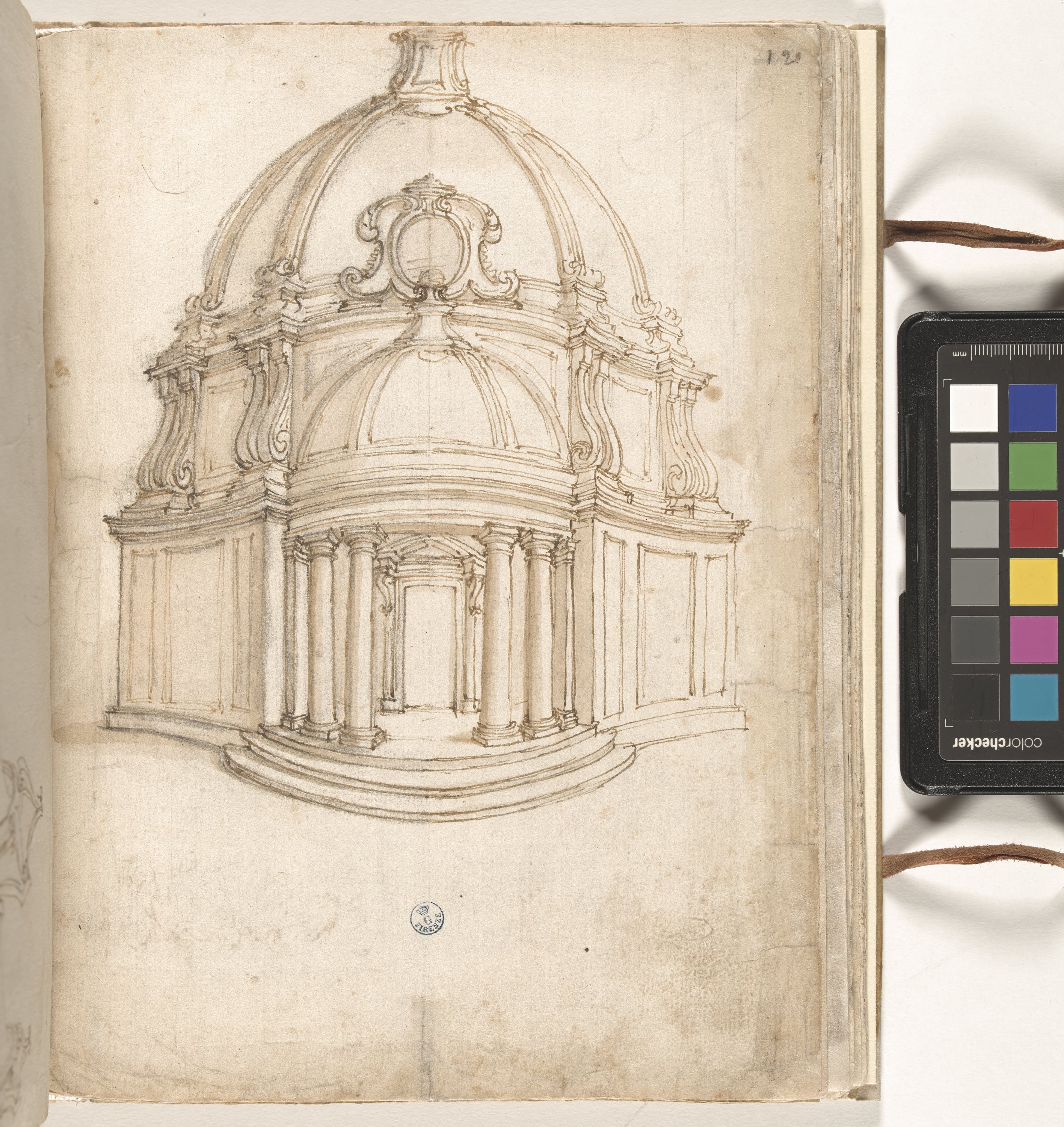 - NOTIZIE STORICO CRITICHE Lankheit (1959-1961, 1962) avanza l'ipotesi che si tratti di uno studio per tabernacolo con precisi riferimenti all'arte del Fischer van Erlach, ma la porticina molto arretrata rispetto al porticato sul davanti mi fa ritenere che si tratti di uno studio per un edificio religioso, probabilmente una cappella principesca. Il progetto è una felice rielaborazione del Foggini di elementi dell'architettura di Pietro da Cortona (si veda per il portico, l'esterno di S. Maria della Pace a Roma). Sul verso gli studi per lavori in commesso di pietre dure, sono probabilmente per una cassetta, si veda la scheda 0900015691 dell'8027 A foglio a c. 13. Per la posizione del foglio nel Giornale, può essere esatta la data intorno al 1715