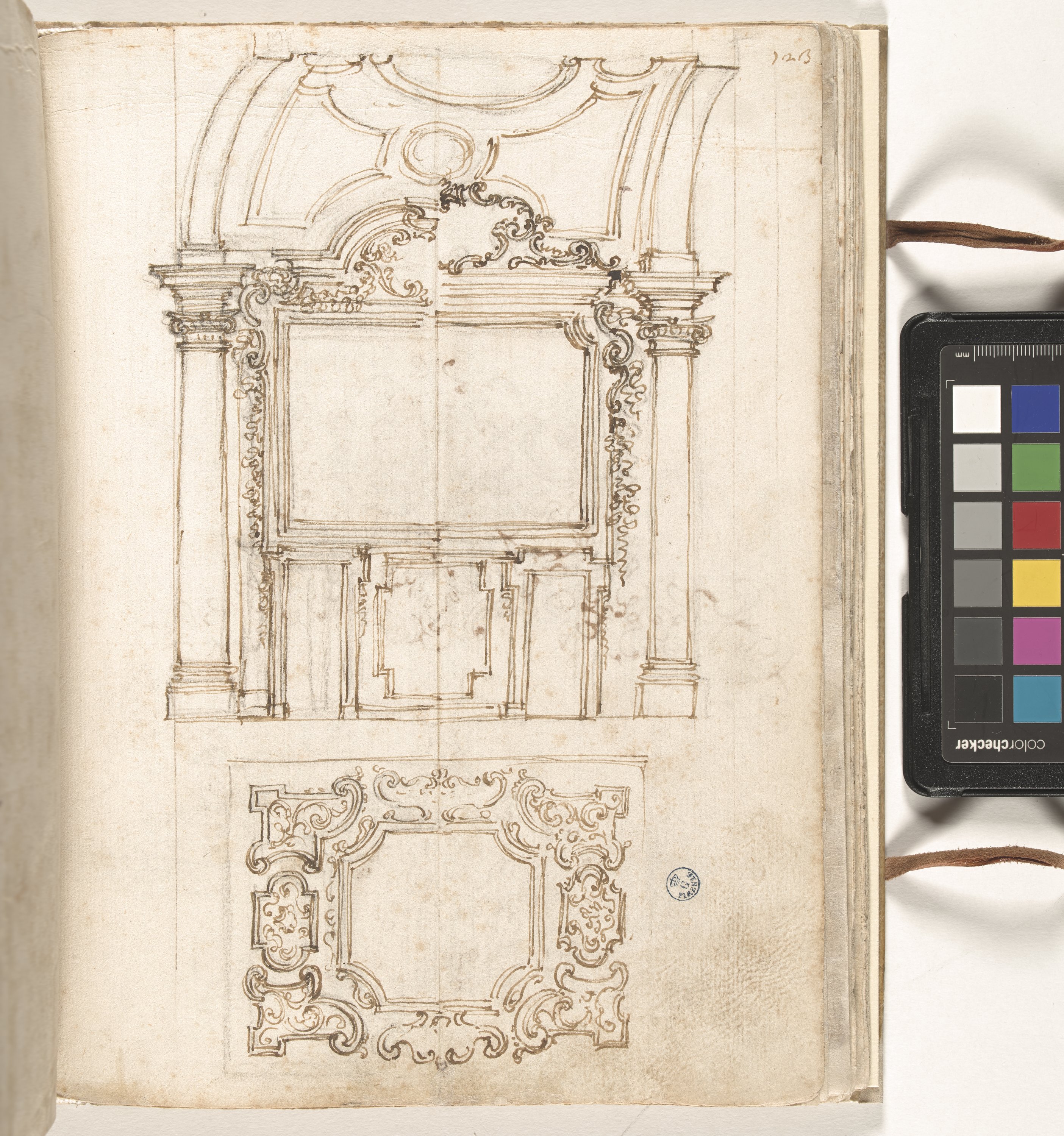 recto: Spaccato di interno con volta a botte riccamente ornato da festoni; cornice architettonica decorata con motivi di volute e cartigli. verso: Motivi decorativi con fiori, volute e conchiglia; nella parte bassa destra del foglio figura seduta con sguardo rivolto in alto e testa maschile barbuta vista di trequarti