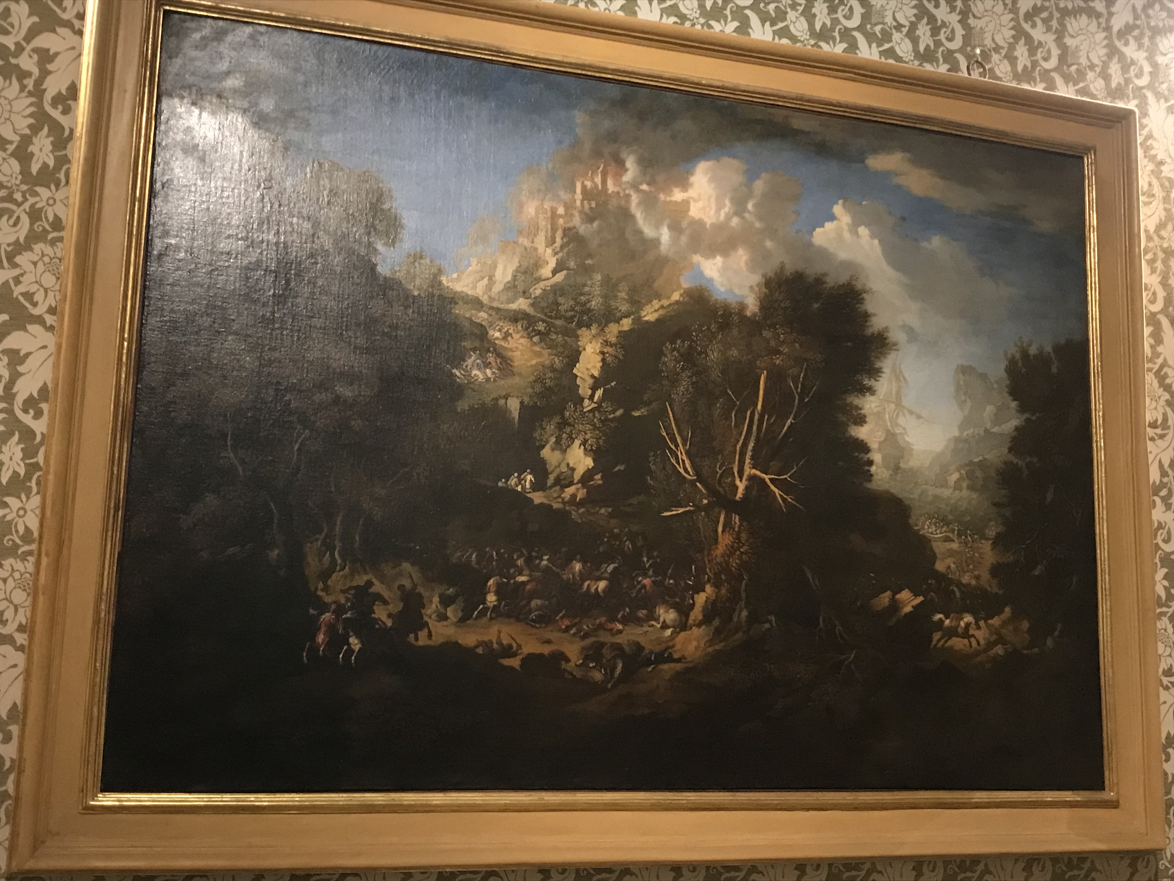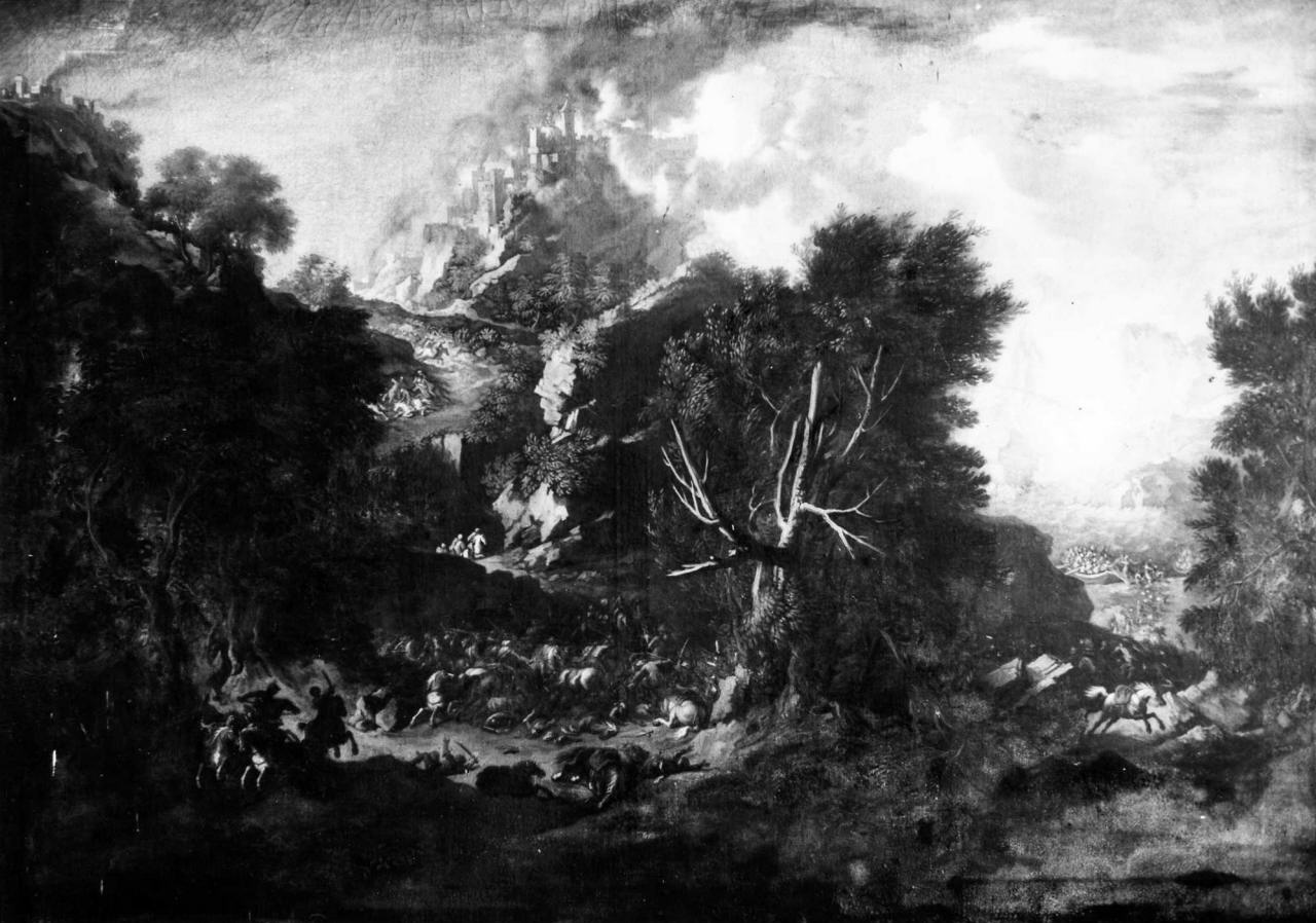- NOTIZIE STORICO CRITICHE Il dipinto fa parte di una serie di quattro ed è sempre stato nella villa della Petraia dove lo vedeva il Gaburri agli inizi del Settecento. L'autore è il polacco Pandolf Resch, italianizzato Pandolfo Reschi, nato a Danzica nel 1643 e noto soprattutto per le sue scene di "battaglia senza eroe" di gusto nordico. non conosciamo con esattezza la data di morte dell'artista, collocata sia nel 1696 sia nel 1699, tuttavia viene seguita l'interpretazione di Novella Barbolani di Montauto che la colloca nel 1696 (Barbolani di Montauto nel 1996). Il dipinto appartiene probabilmente alla sua ultima produzione, databile nell'ultima decade della sua vita, compresa quindi fra la fine degli anni ottanta e gli anni novanta del Seicento, nella quale è individuabile un equilibrio fra la rappresentazione del paesaggio e quella della battaglia. Le figure si inseriscono nel paesaggio e interagiscono con esso, tanto da fare pensare che le vedute rappresentate siano la riproduzione di luoghi che il pittore stesso ha potuto ammirare e non scenari fantastici