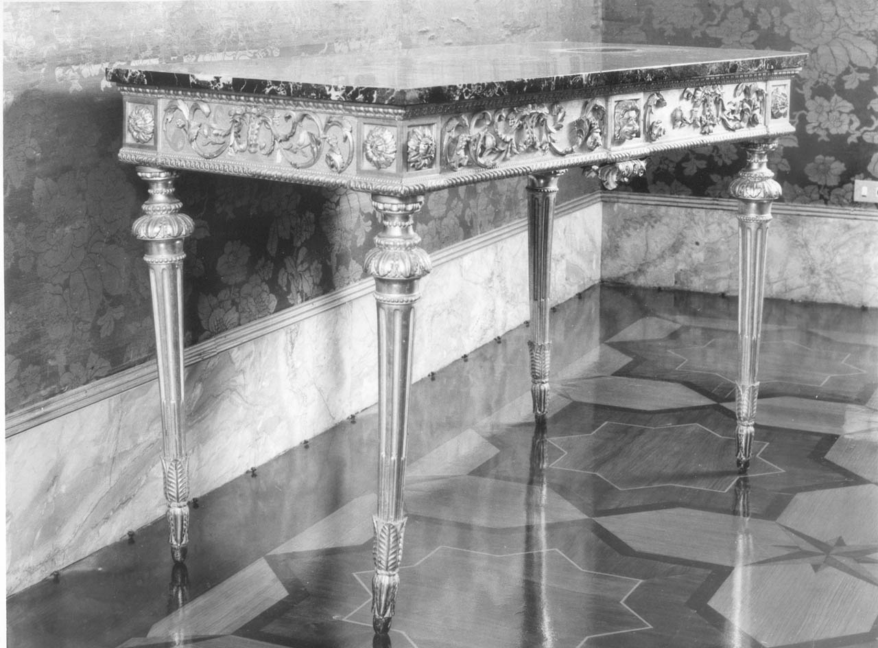 tavolo di faggio intagliato e dorato con piano di verde di Genova massello. La fascia è ornata di rapporti d'intaglio a tralci di foglie interrotta da una maschera nel centro